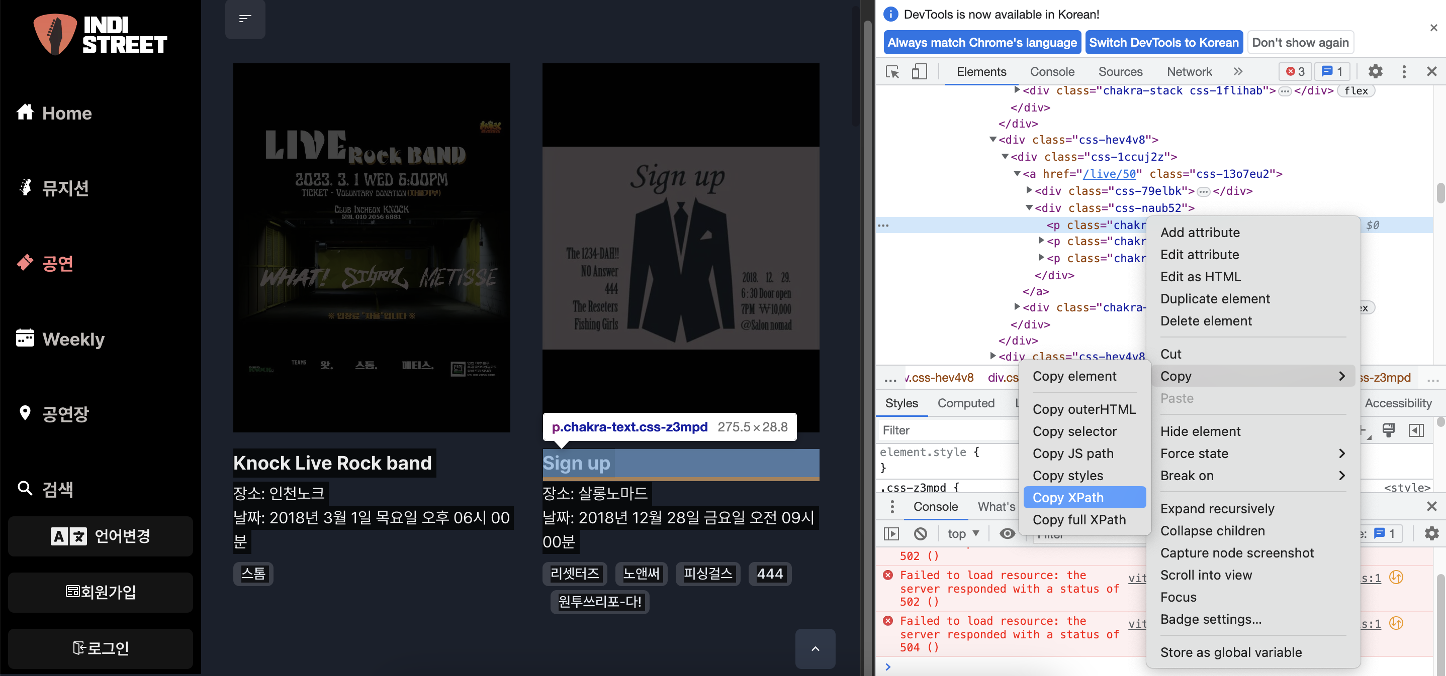 사이트에 있는 행사의 이름들을 스크래핑 해봅니다: https://indistreet.com/live?sortOption=startDate%3AASC