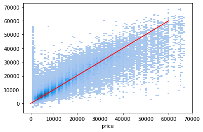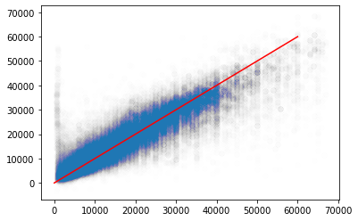 plt.plot([0, 60000], [0, 60000], 'r-')