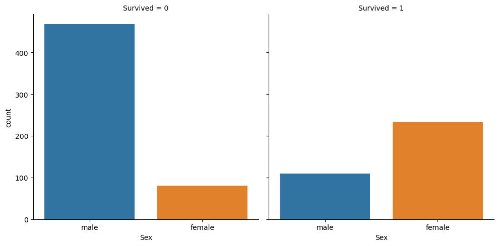 sns.catplot(x='Sex', col='Survived', kind='count', data=titanic_df)