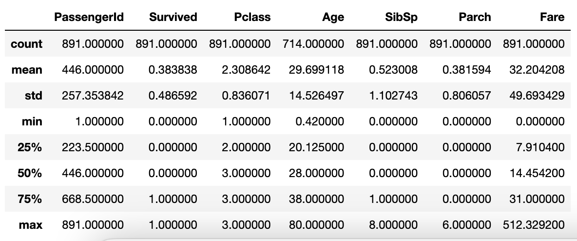 titanic_df.describe() # 수치형 데이터에 대한 요약만을 제공