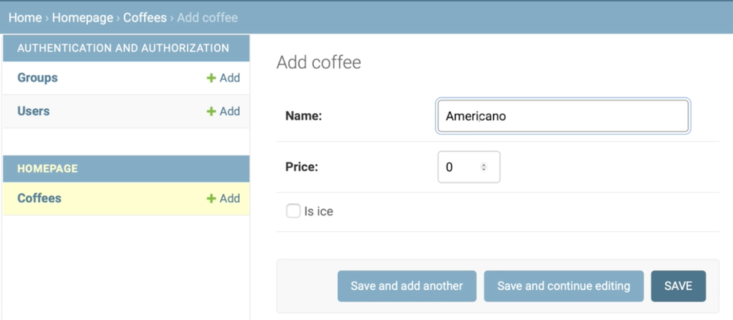 장고에 커피를 추가하고, 그 안에 name, price, is_ice를 추가합니다.