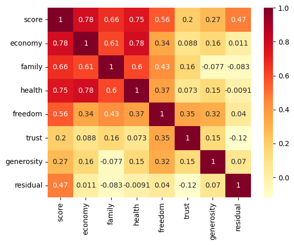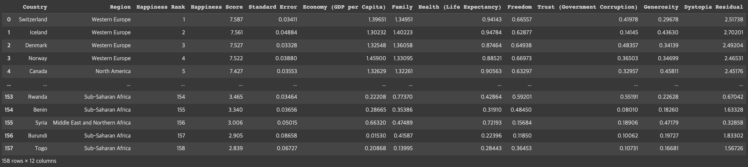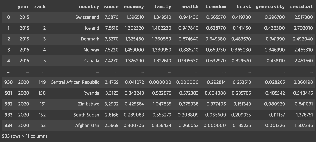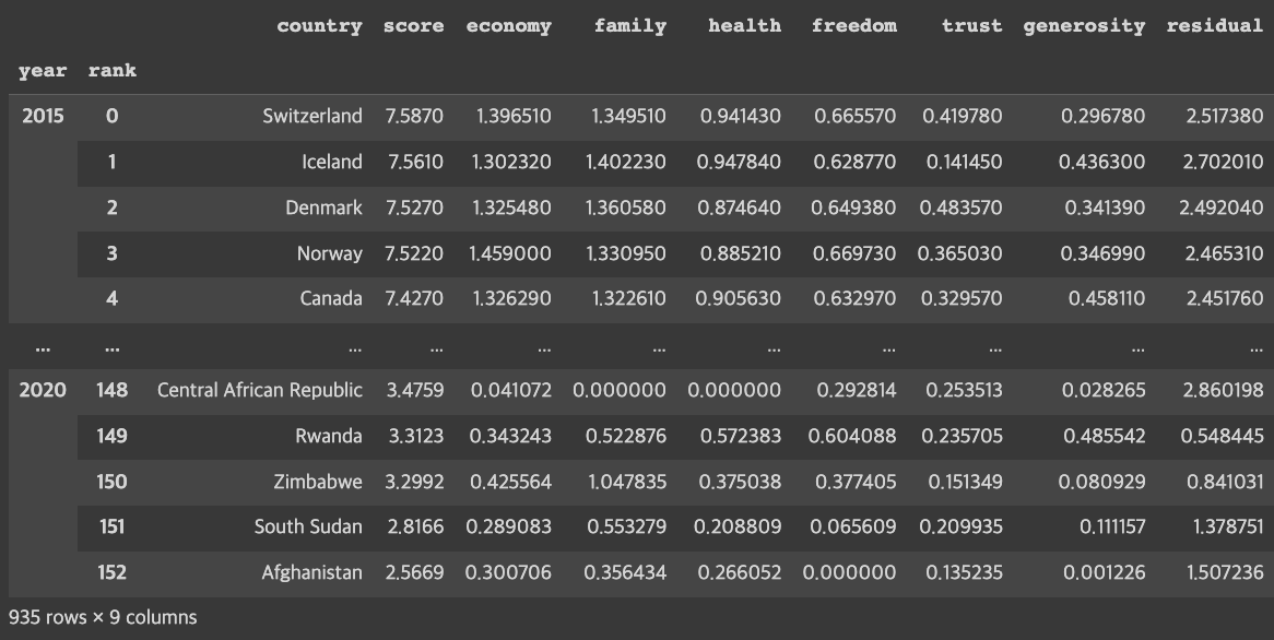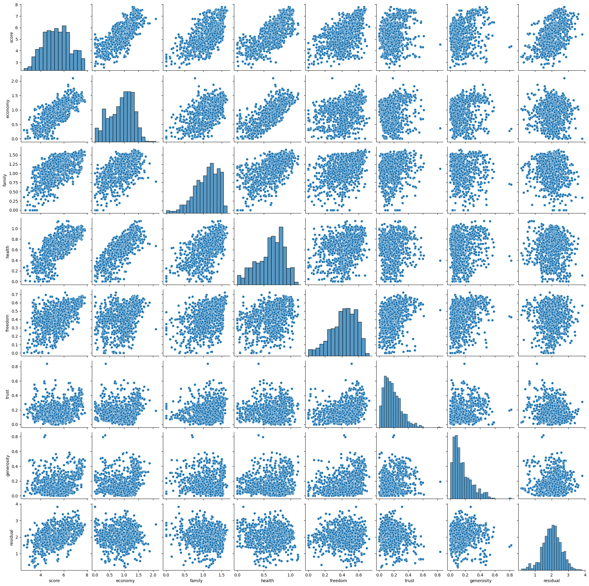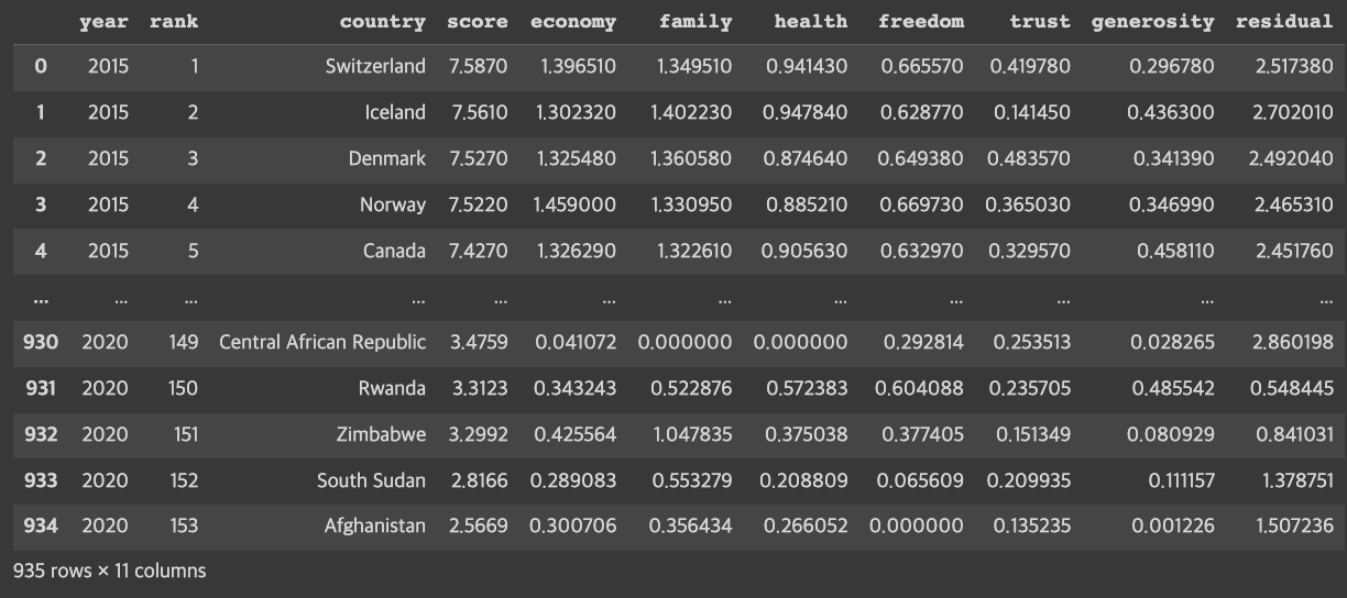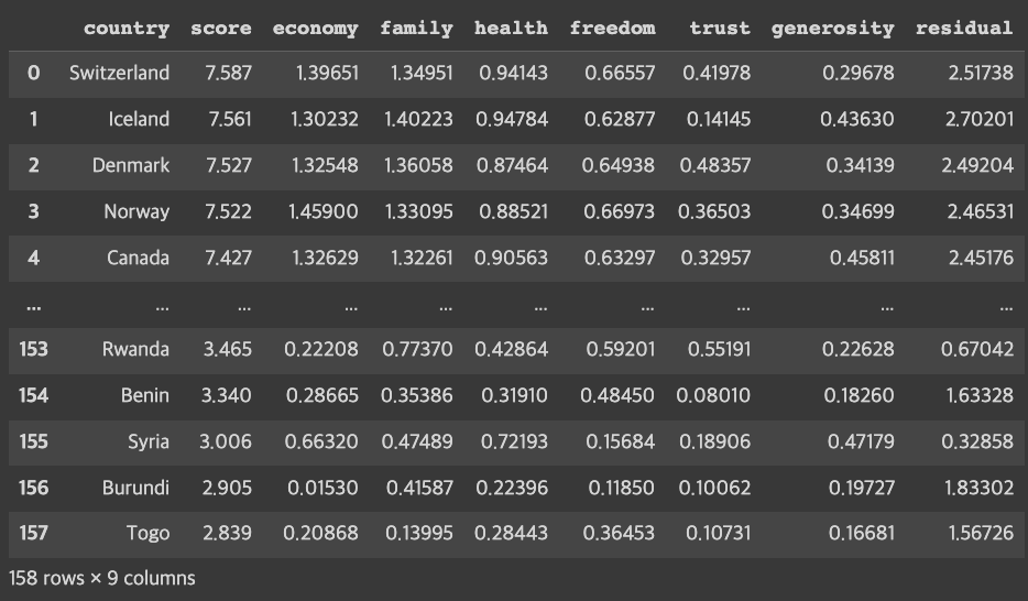 cols = ['country', 'score', 'economy', 'family', 'health', 'freedom', 'trust', 'generosity', 'residual']