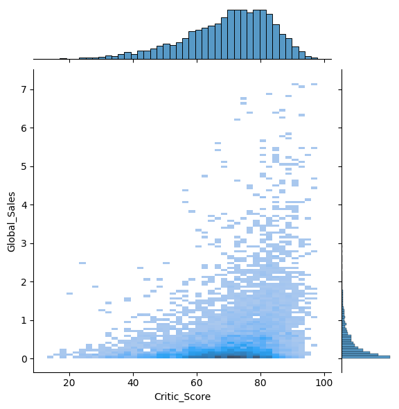 sns.jointplot(x='Critic_Score', y='Global_Sales', data=df, kind='hist')