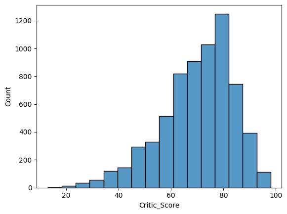 sns.histplot(x='Critic_Score', data=df, bins=16)