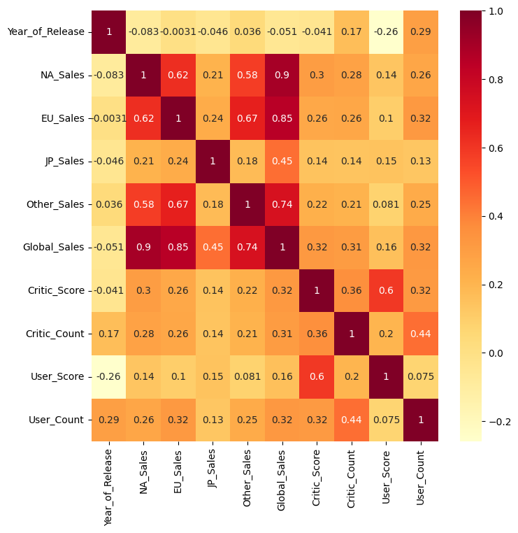 sns.heatmap(df.corr(), annot=True, cmap='YlOrRd')