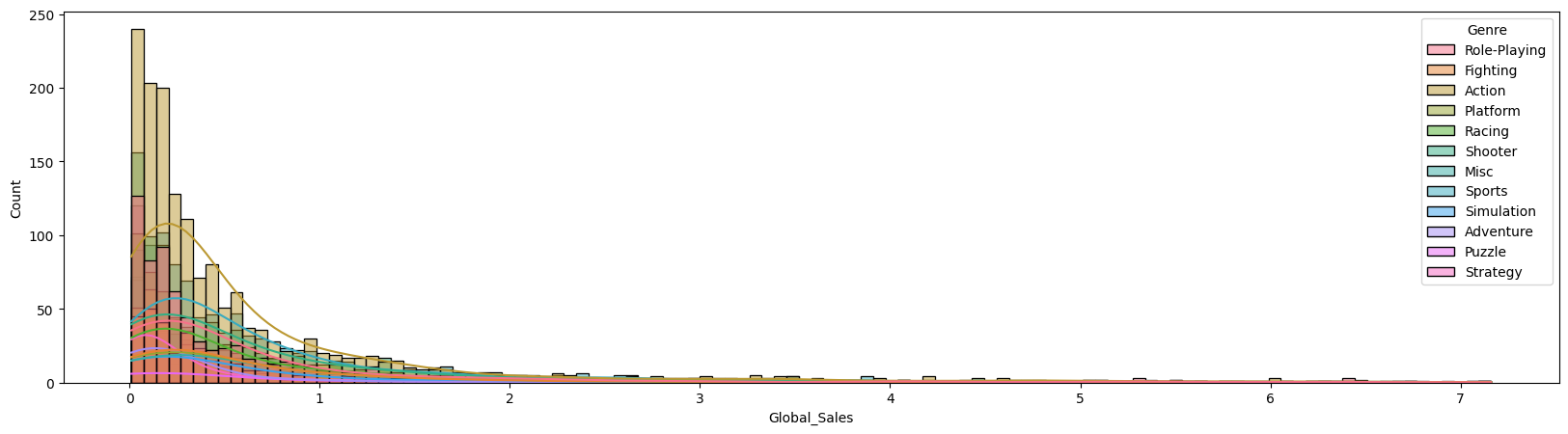 sns.histplot(x='Global_Sales', hue='Genre', kde=True, data=df)