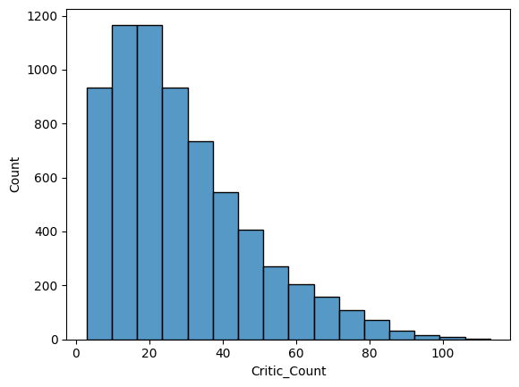 sns.histplot(x='Critic_Count', data=df, bins=16)