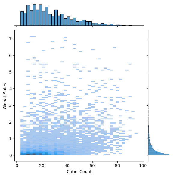 sns.jointplot(x='Critic_Count', y='Global_Sales', data=df, kind='hist')