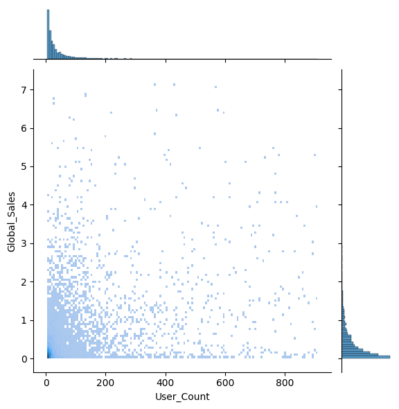 sns.jointplot(x='User_Count', y='Global_Sales', data=df, kind='hist')
