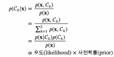 - 추론단계: 결합확률분포 p(x, Ck)를 구하는 것(p(Ck|x)를 직접 구하는 경우도 있음). 이것만 있으면 모든 것을 할 수 있음.