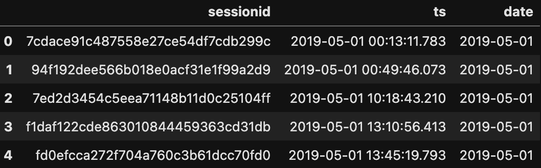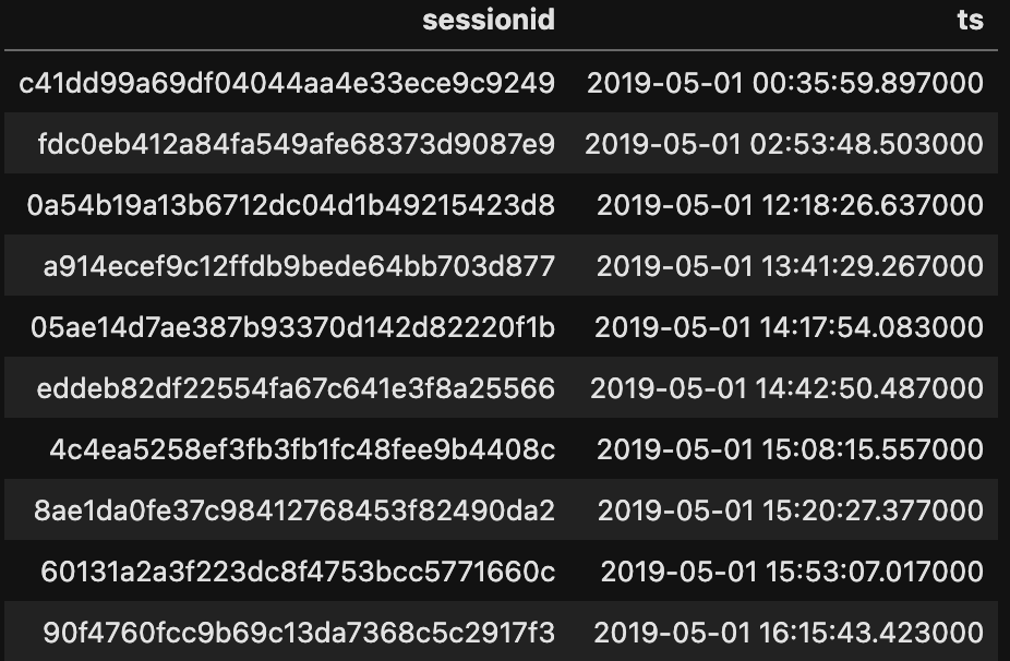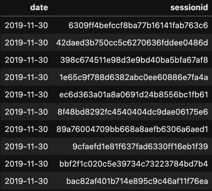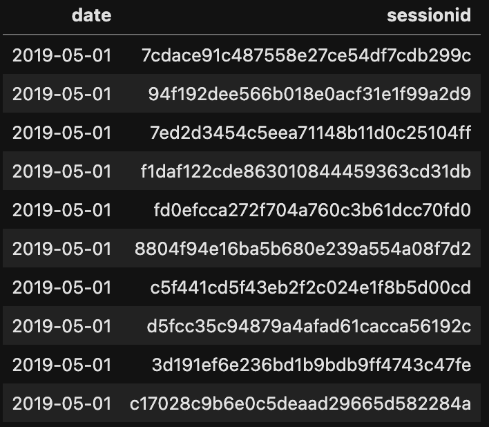 SELECT DATE(ts) date, sessionID FROM raw_data.session_timestamp LIMIT 10;