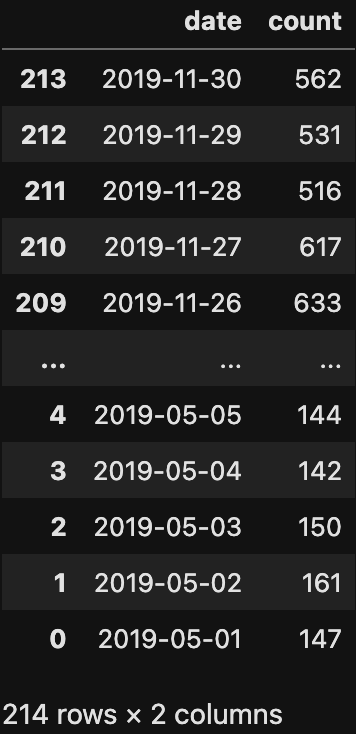df_st.groupby(["date"])["sessionid"].count().reset_index(name='count').sort_values("date", ascending=False)