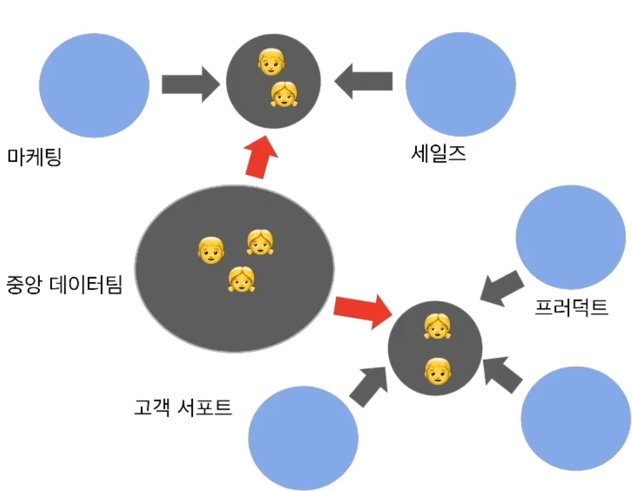 - 중앙집중 구조: 모든 데이터 팀원들이 하나의 팀으로 존재