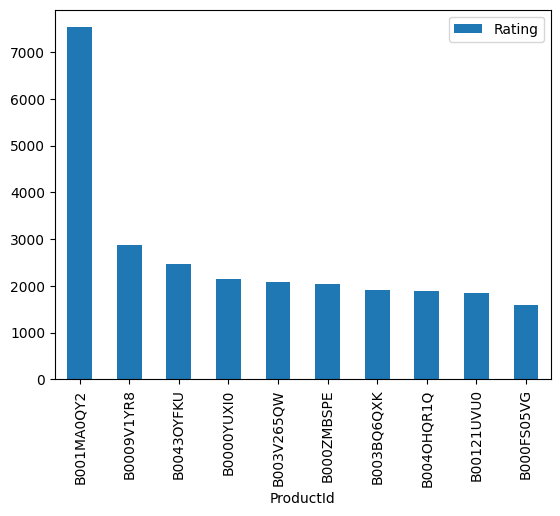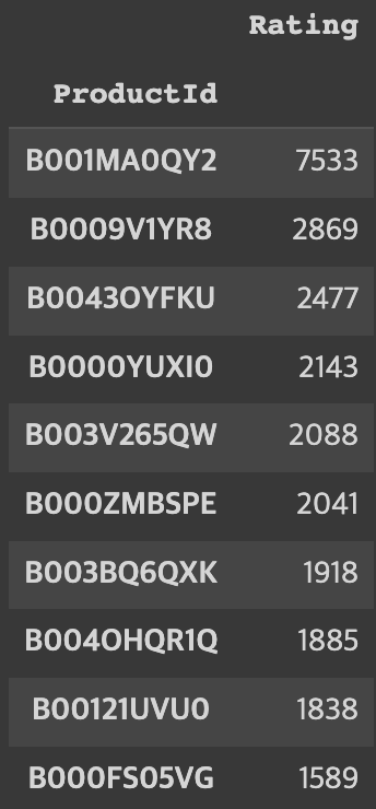 popular_products = pd.DataFrame(amazon_ratings.groupby('ProductId')['Rating'].count())