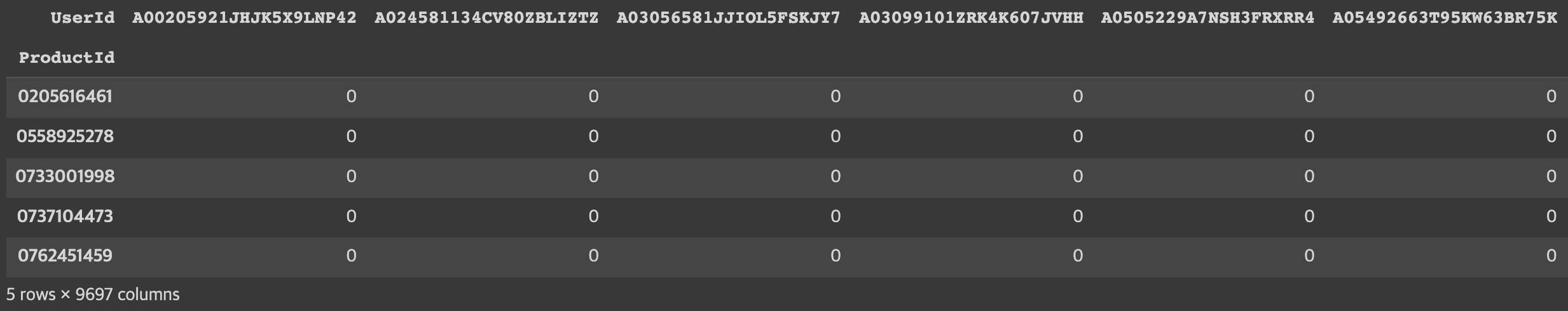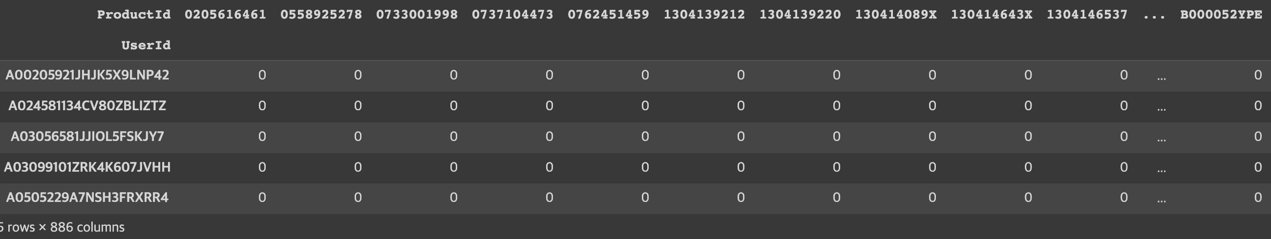 ratings_utility_matrix = amazon_ratings1.pivot_table(values='Rating', index='UserId', columns='ProductId', fill_value=0)