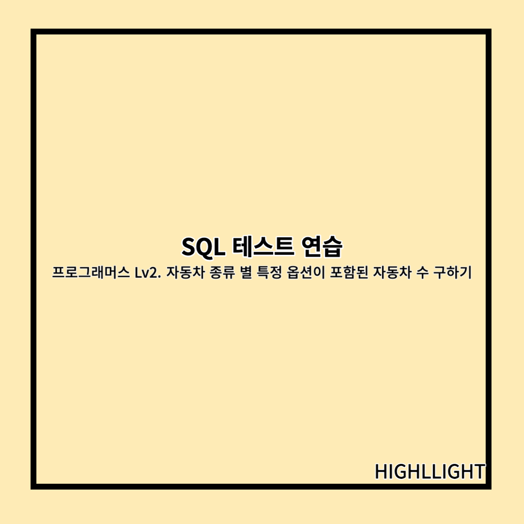 '통풍시트', '열선시트', '가죽시트' 중 하나 이상의 옵션이 포함된 자동차를 조회하기 위해 '%'를 사용했으며, 자동차 종류를 기준으로 오름차순 정렬하는 쿼리를 작성했다.