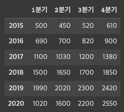 df = pd.DataFrame([[500, 450, 520, 610], [690, 700, 820, 900], [1100, 1030, 1200, 1380], [1500, 1650, 1700, 1850], [1990, 2020, 2300, 2420], [1020, 1600, 2200, 2550]], index = ['2015', '2016', '2017', '2018', '2019', '2020'], columns = ['1분기', '2분기', '3분기', '4분기'])