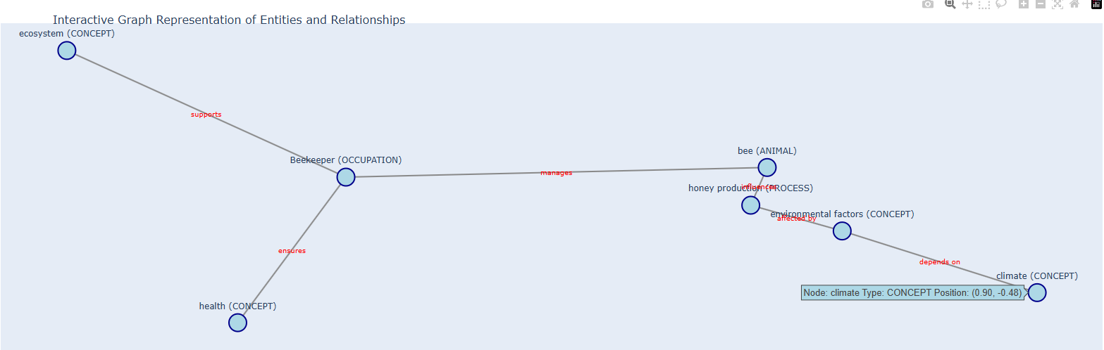 - 중복 제거 (Deduplication): 동일 개체가 여러 번 등장하는 경우, 중복을 제거하여 그래프의 효율성을 높입니다. 예를 들어, 여러 문서에서 등장하는 'Beekeeper' 개체는 하나로 통합됩니다.