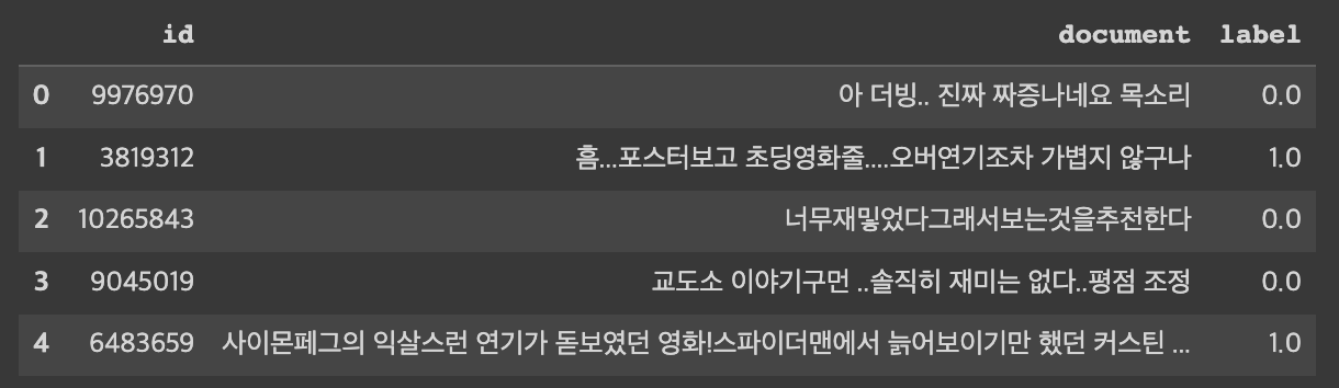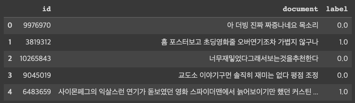 훈련용 데이터에는 150,000개의 샘플이 있는데, document 칼럼 값이 non-null인 샘플이 149,995개다. 따라서 5개의 결측치가 있다는 것을 알 수 있다. 결측치를 제거한다.