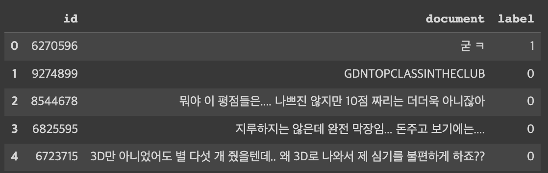 nsmc_train_df = pd.read_csv('/content/ratings_train.txt', encoding = 'utf8', sep = '\t', engine = 'python')