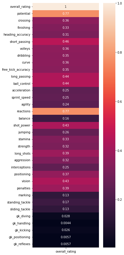 sns.heatmap(df_player_att.drop(['id', 'player_fifa_api_id', 'player_api_id'], axis=1).corr()[['overall_rating']], annot=True)