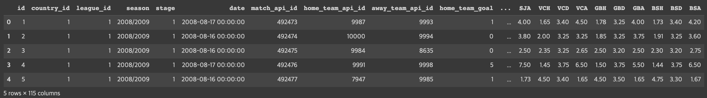 id country_id league_id season stage date match_api_id home_team_api_id away_team_api_id home_team_goal away_team_goal home_player_X1 home_player_X2 home_player_X3 home_player_X4 home_player_X5 home_player_X6 home_player_X7 home_player_X8 home_player_X9 home_player_X10 home_player_X11 away_player_X1 away_player_X2 away_player_X3 away_player_X4 away_player_X5 away_player_X6 away_player_X7 away_player_X8 away_player_X9 away_player_X10 away_player_X11 home_player_Y1 home_player_Y2 home_player_Y3 home_player_Y4 home_player_Y5 home_player_Y6 home_player_Y7 home_player_Y8 home_player_Y9 home_player_Y10 home_player_Y11 away_player_Y1 away_player_Y2 away_player_Y3 away_player_Y4 away_player_Y5 away_player_Y6 away_player_Y7 away_player_Y8 away_player_Y9 away_player_Y10 away_player_Y11 home_player_1 home_player_2 home_player_3 home_player_4 home_player_5 home_player_6 home_player_7 home_player_8 home_player_9 home_player_10 home_player_11 away_player_1 away_player_2 away_player_3 away_player_4 away_player_5 away_player_6 away_player_7 away_player_8 away_player_9 away_player_10 away_player_11 goal shoton shotoff foulcommit card cross corner possession B365H B365D B365A BWH BWD BWA IWH IWD IWA LBH LBD LBA PSH PSD PSA WHH WHD WHA SJH SJD SJA VCH VCD VCA GBH GBD GBA BSH BSD BSA